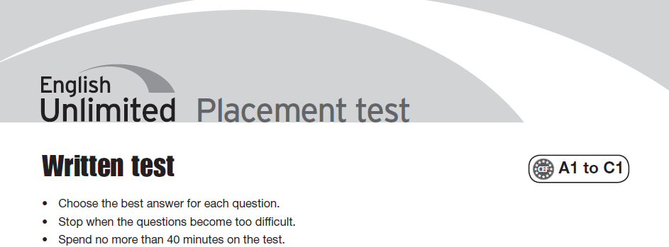 This course is available just for taking the Placement Test from the book English Unlimited. It is here with the purpose of knowing the lever of the particular student or actual students belonging to my classes.